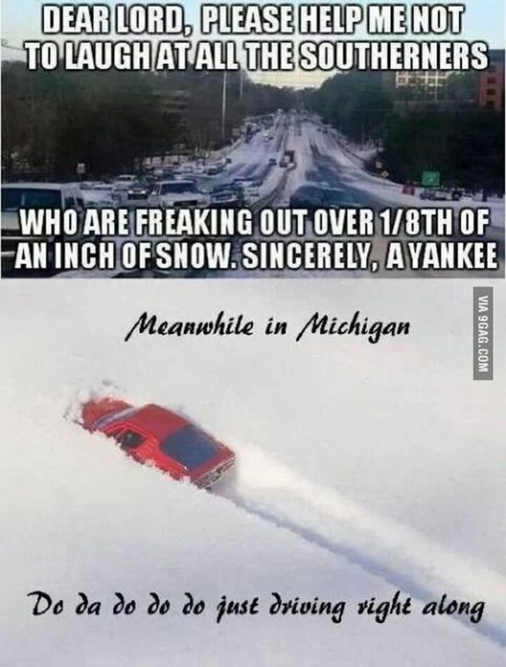 “Dear lord, please help me not to laugh at all the southerners who are freaking out over 1/8th of an inch of snow. Sincerely, a Yankee. Meanwhile in Michigan: Just driving right along.”