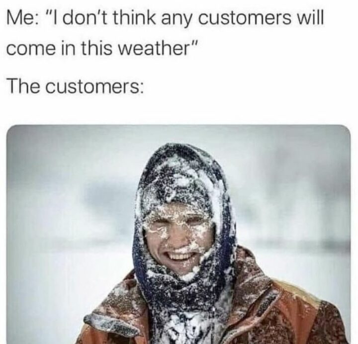 “Me: I don’t think any customers will come in this weather. The customers:”