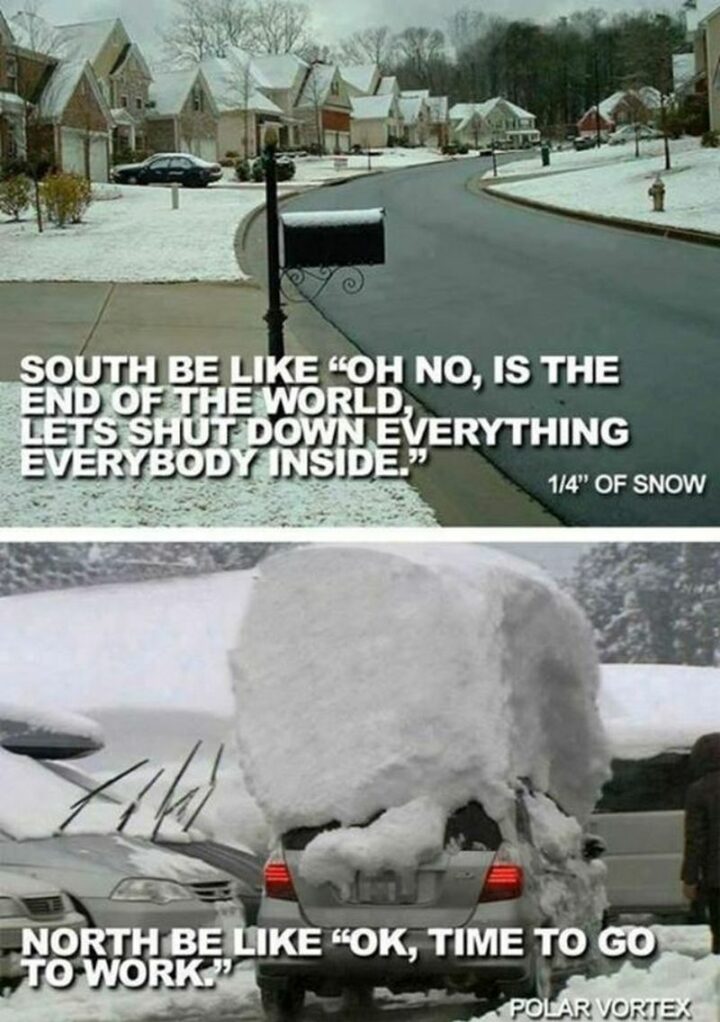“1/4 inch of snow: South be like, ‘Oh no, is the end of the world, let’s shut down everything. Everybody inside.’ Polar vortex: North be like, ‘Ok, time to get to work.'”