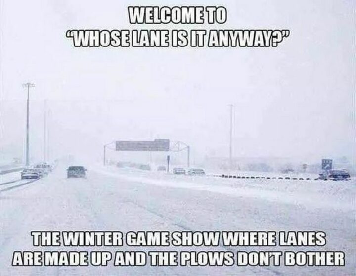 “Welcome to ‘Whose lane is it anyway?’ The winter game show where lanes are made up and the plows don’t bother.”