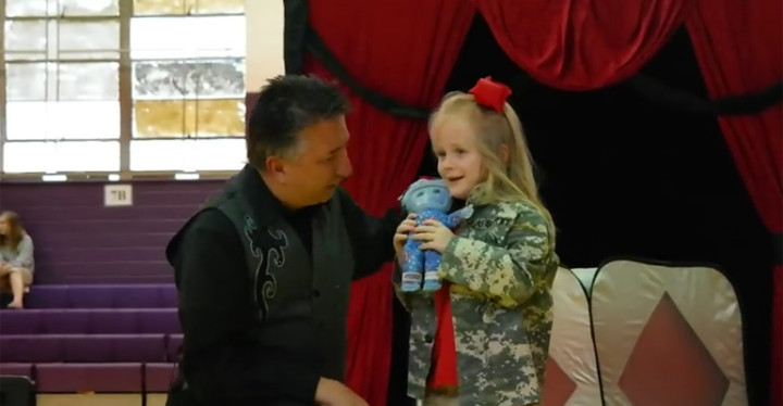 Watch as Army soldiers surprise their daughter at the school magic show!