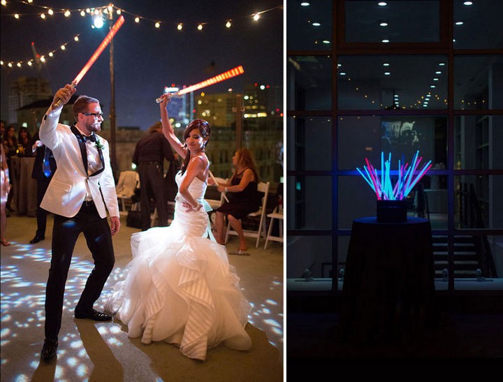 The newlyweds show their Jedi mastery with a lightsaber dance.