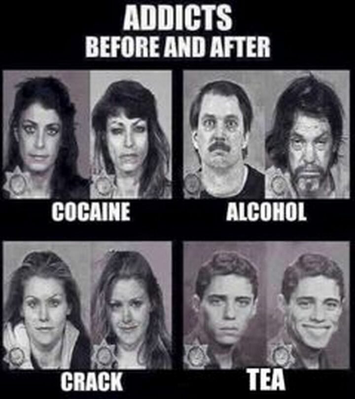 “Addicts before and after: Cocaine. Alcohol. Crack. Tea.”