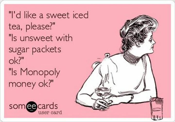 “I’d like a sweet iced tea, please. Is unsweet with sugar packets ok? Is Monopoly money ok?”