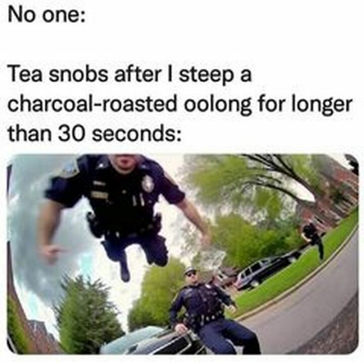 “No one: Tea snobs after I steep a charcoal-roasted oolong for longer than 30 seconds.”