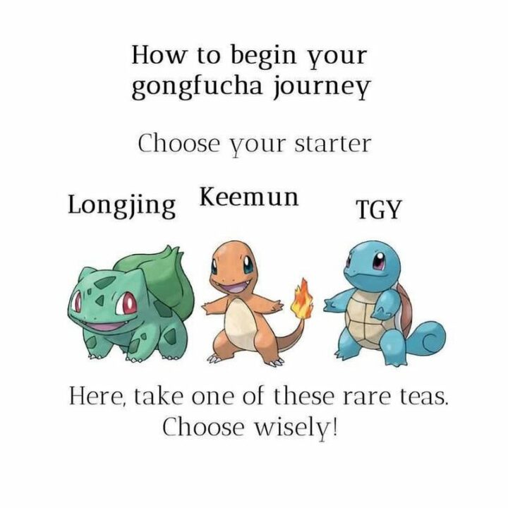 “How to begin your gongfu cha journey. Choose your starter: Longjing, Keenum, or TGY. Here, take one of these rare teas. Choose wisely!”