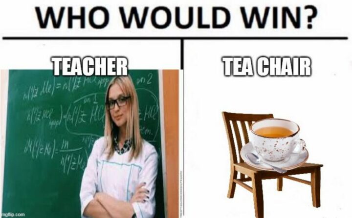 “Who would win? Teacher. Tea chair.”