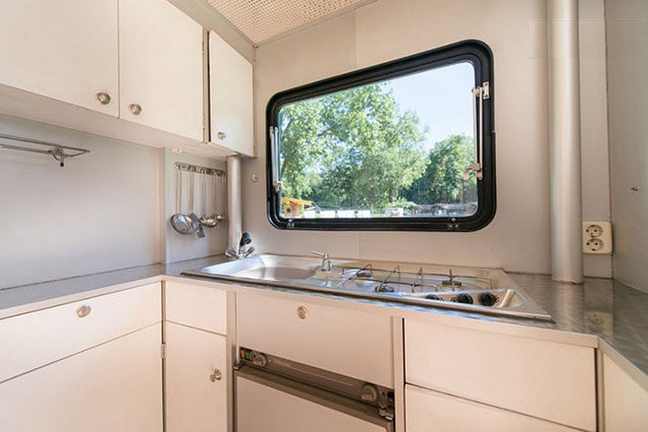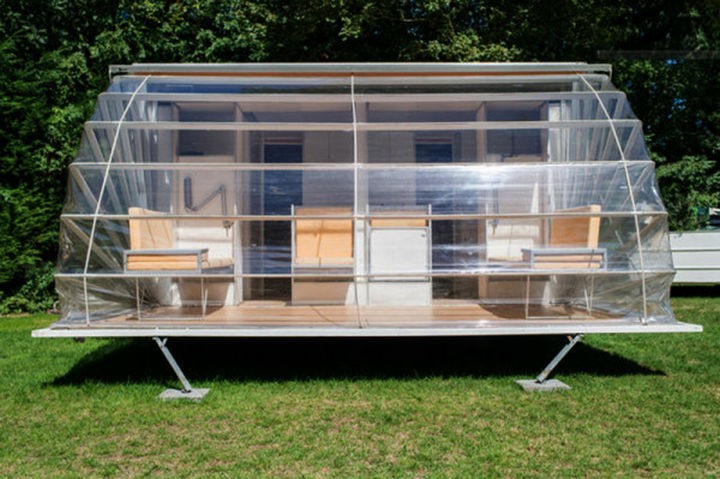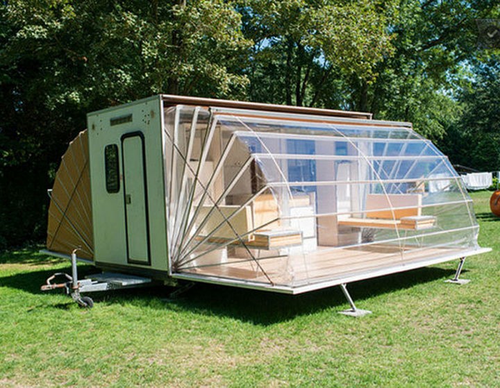 It is a very small trailer when its awnings are closed but when the walls of the trailer are opened, it reveals nearly 3 times more floorspace and almost turns into a tiny house. This and many other trailers are displayed in Amsterdam at The Urban Campsite, a yearly exposition of unique mobile campers that runs for 6 weeks between August and September. Guests can reserve to stay in any of the campers that are on display.