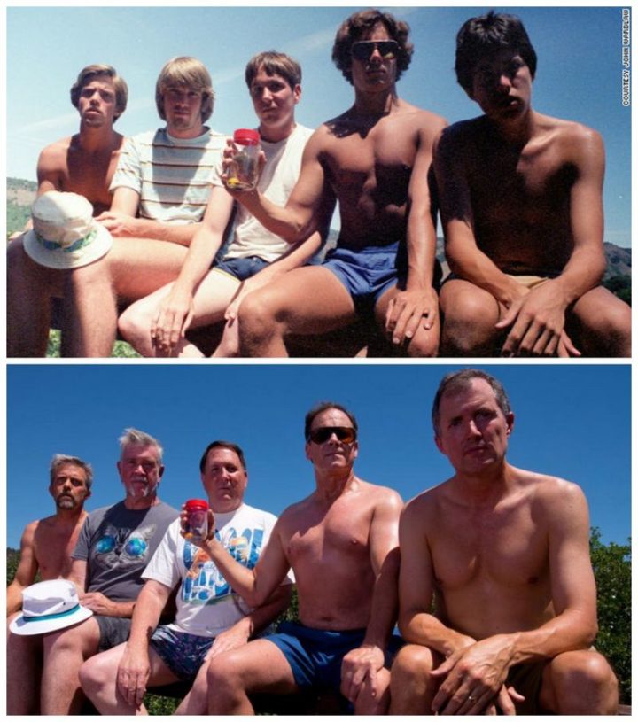 1) “Every five years from 1982-2017, five men take the same photo at their cabin at Copco Lake in California.”