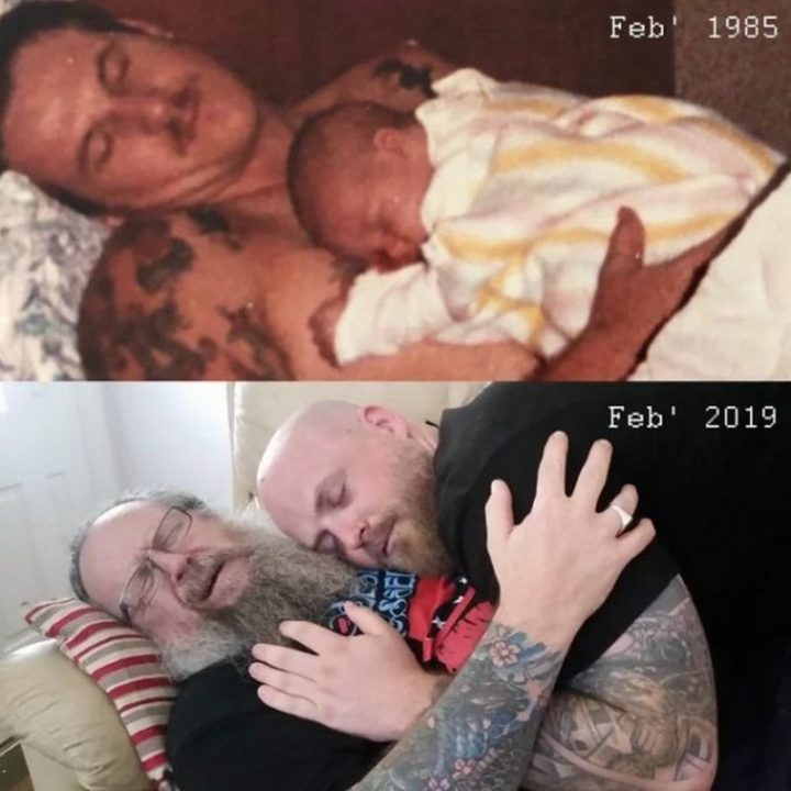 32) “Nearly 30 years elapsed; just before my retirement, we re-created my favorite photo of my oldest son & I…”