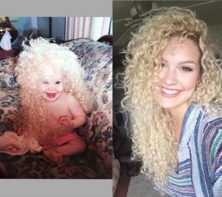 6) “Then and now pictures of me as a baby wearing a ridiculous wig vs. me at 21 with the hair I ended up growing.”