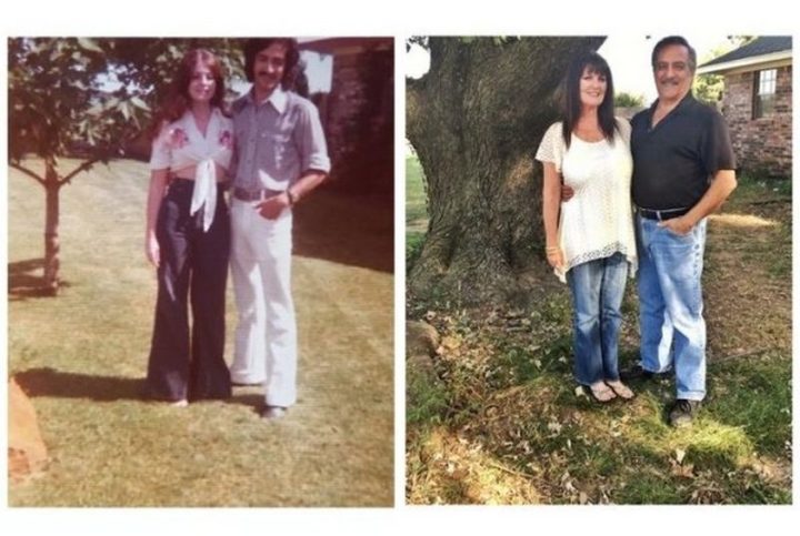 8) “Then and now pictures of my parents standing by their tree in 1975 and now in 2016.”