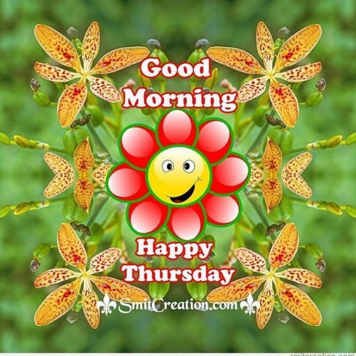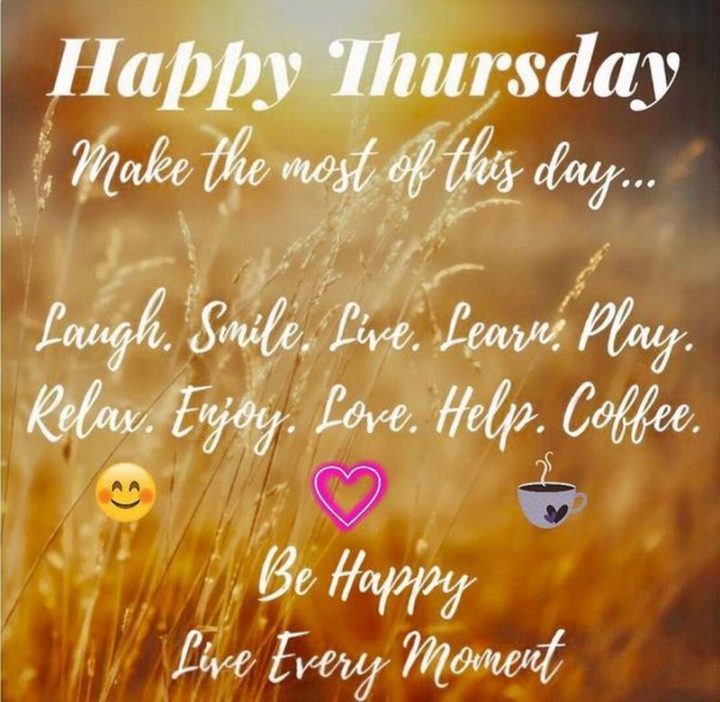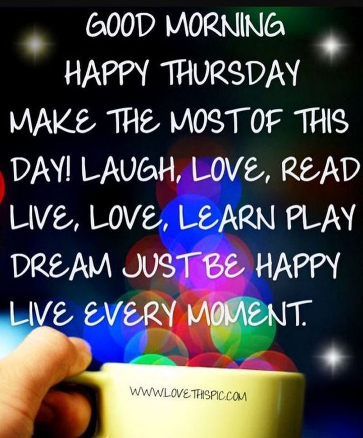 “Good morning. Happy Thursday. Make the most of this day! Laugh, love, read, live, love, learn, play, dream, and just be happy. Live every moment.”