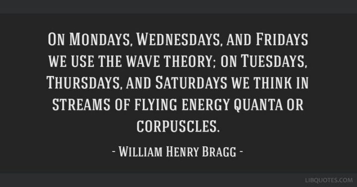 “On Mondays, Wednesdays, and Fridays we use the wave theory; on Tuesdays, Thursdays, and Saturdays we think in streams of flying energy quanta or corpuscles.” – William Henry Bragg