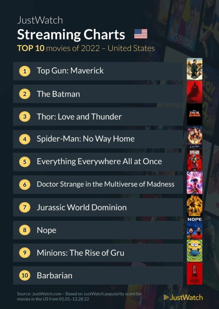 There was an abundance of competition in 2022, yet the most-streamed movies of 2022 remain to be blockbuster hits like “Top Gun: Maverick” and DC’s critically acclaimed “The Batman”. Both films garnered a passionate fan following and remain at the top of their respective genres.