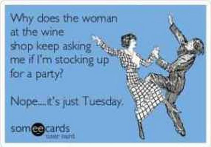 “Why does the woman at the wine shop keep asking me if I’m stocking up for a party? Nope…It’s just Tuesday.”
