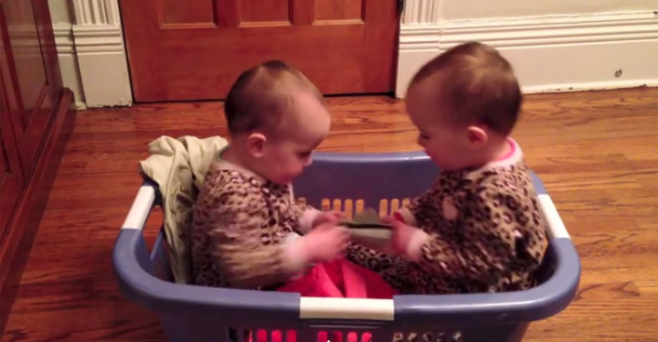 Please share these hilarious twin babies talking in a laundry basket with your friends and family.