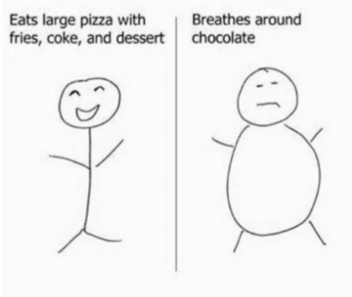 “Eats large pizza with fries, Coke, and dessert. Breathes around chocolate.”