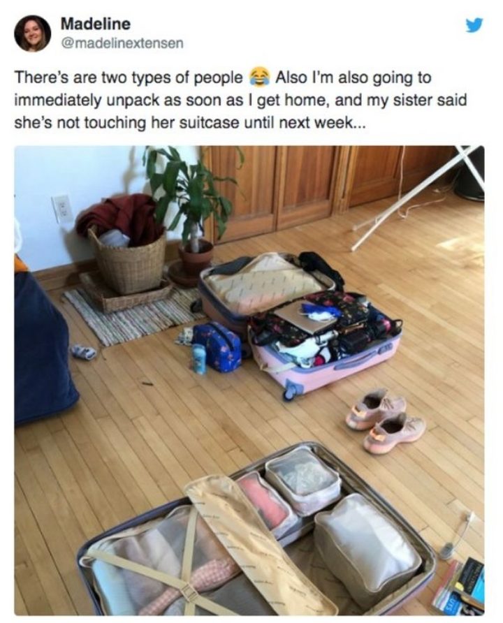 “Also, I’m also going to immediately unpack as soon as I get home, and my sister said she’s not touching her suitcase until next week…”