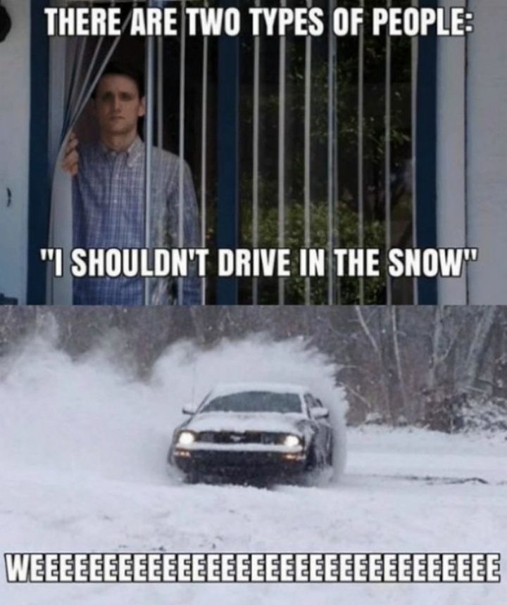 “There are two types of people: ‘I shouldn’t drive in the snow’ vs. ‘Weeeeeeeee'”