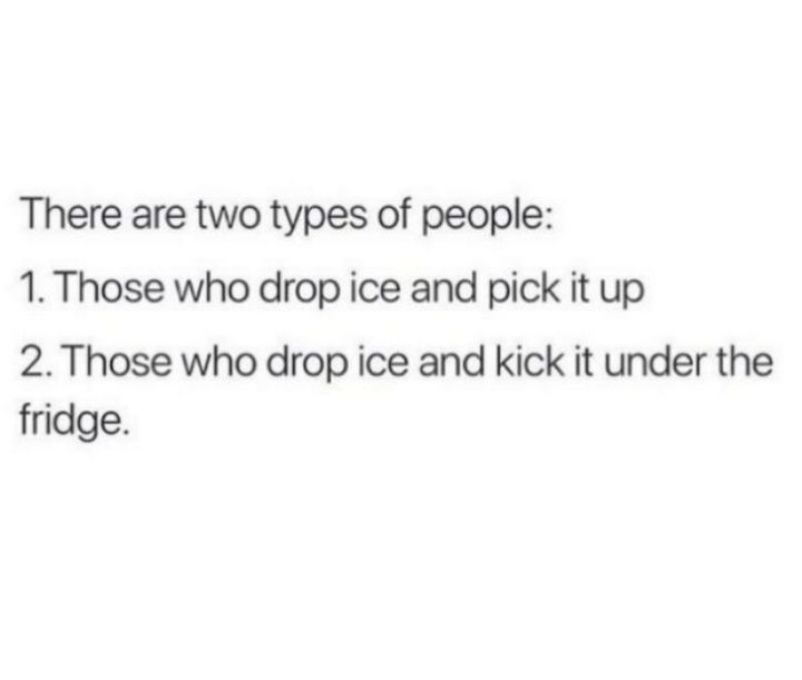 “1) Those who drop ice and pick it up. 2) Those who drop ice and kick it under the fridge.”