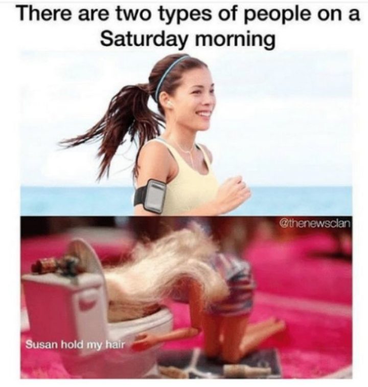 “Saturday morning run vs. ‘Susan hold my hair’.”