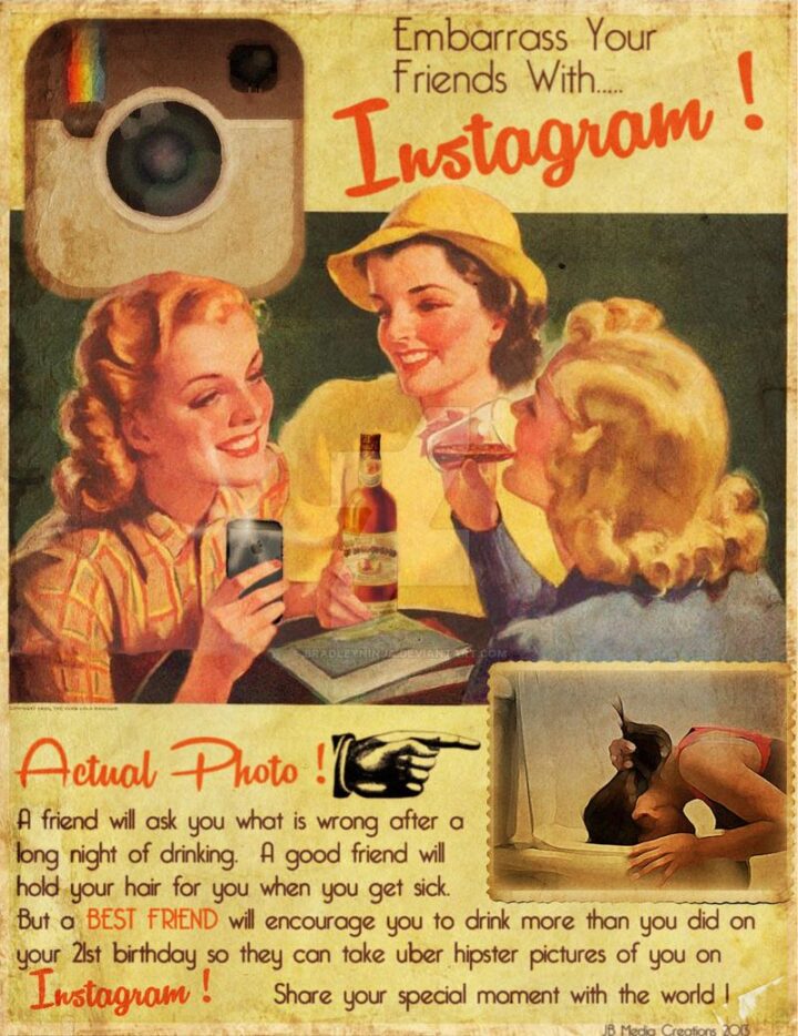 “Embarrass your friends with Instagram! Actual photo! A friend will ask you what is wrong after a long night of drinking. A good friend will hold your hair for you when you get sick. But a best friend will encourage you to drink more than you did on your 21st birthday so they can take uber hipster pictures of you on Instagram! Share your special moment with the world!”