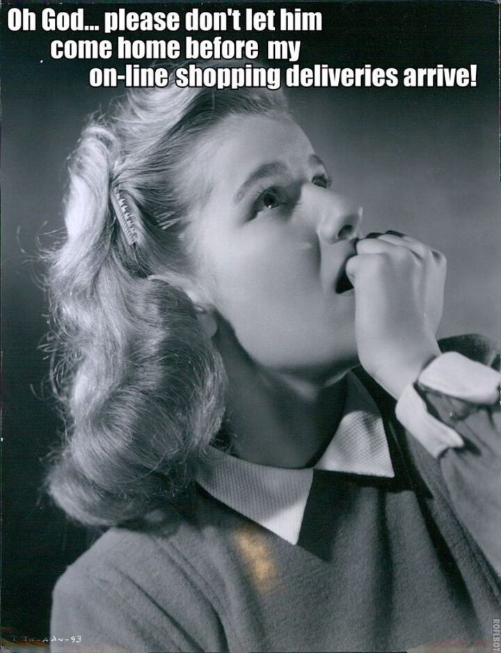 “Oh God,…Please don’t let him come home before my online shopping deliveries arrive!”