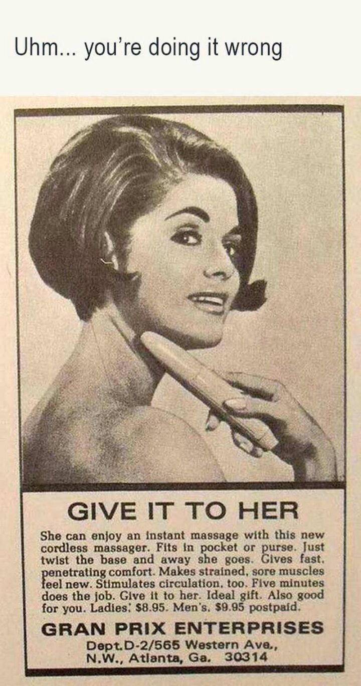 “Uhm…You’re doing it wrong: Give it to her. She can enjoy an instant massage with this new cordless massager. Fits in a pocket or purse. Just twist the base and away she goes. Gives fast, penetrating comfort. Makes strained, sore muscles feel like new. Stimulates circulation, too. Five minutes does the job. Give it to her. Ideal gift. Also good for you. Ladies, $8.95. Men’s, $9.95 postpaid.”