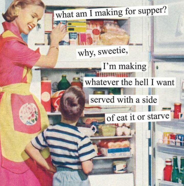 “What am I making for supper? Why, sweetie, I’m making whatever the hell I want served with a side of eat it or starve.” Like this image? Order a fridge magnet.