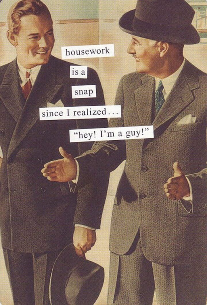 “Housework is a snap since I realized…Hey! I’m a guy!”
