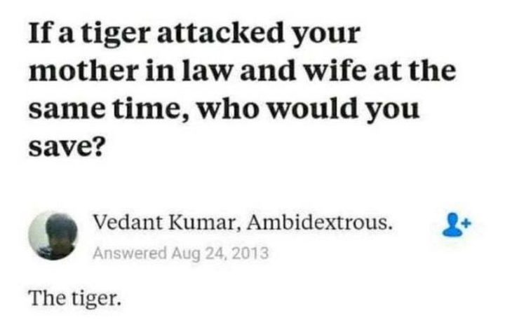 “If a tiger attacked your mother-in-law and wife at the same time, who would you save? The tiger.”