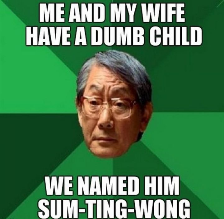 “Me and my wife have a dumb child. We named him Sum-Ting-Wong.”