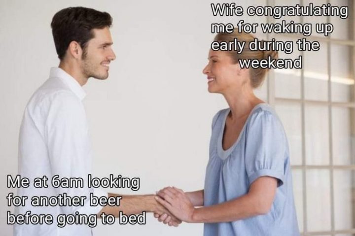 “Wife congratulating me for waking up early during the weekend. That’s me at 6 am looking for another beer before going to bed.”