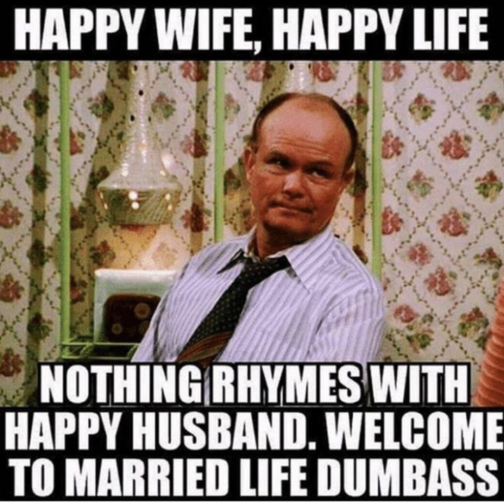 “Happy wife, happy life. Nothing rhymes with a happy husband. Welcome to married life dumbass.”
