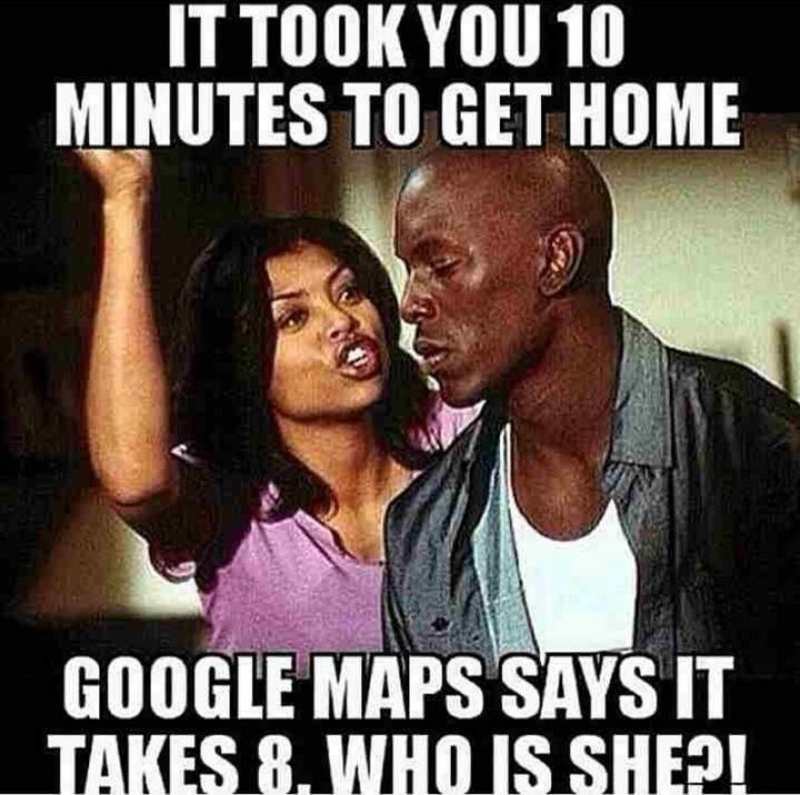 “It took you 10 minutes to get home. Google Maps says it takes 8. Who is she?!”