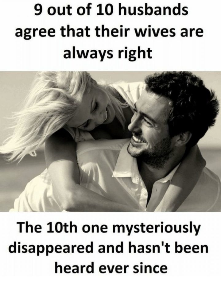 “9 out of 10 husbands agree that their wives are always right. The 10th one mysteriously disappeared and hasn’t been heard ever since.”