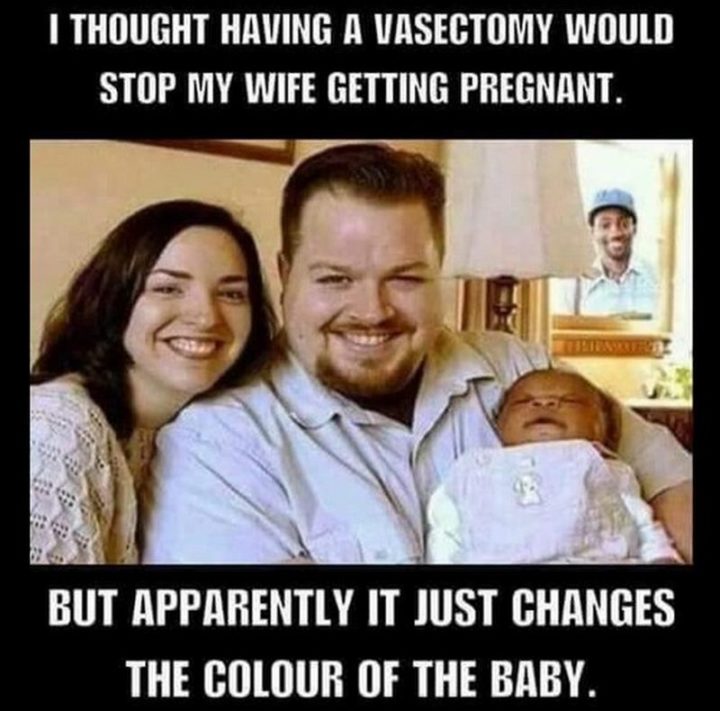 “I thought having a vasectomy would stop my wife from getting pregnant. But apparently, it just changes the color of the baby.”