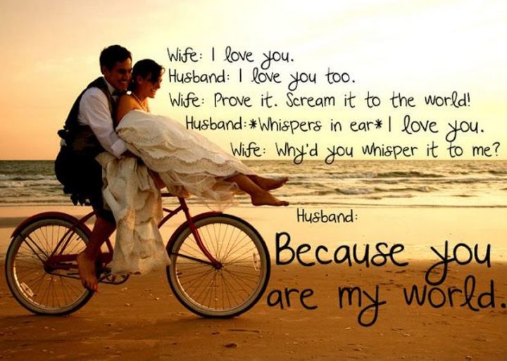 “Wife: I love you. Husband: I love you too. Wife: Prove it. Scream it to the world! Husband: *whispers in ear* I love you. Wife: Why’d you whisper it to me? Husband: Because you are my world.”