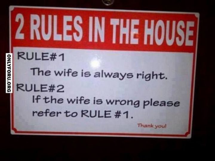 “2 Rules in the house. Rule #1: The wife is always right. Rule #2: If the wife is wrong please refer to rule #1. Thank you!”