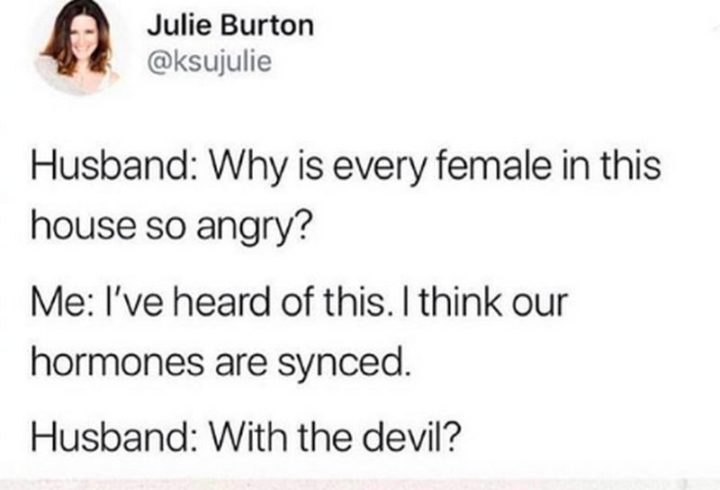 “Husband: Why is every female in this house so angry? Me: I’ve heard of this. I think our hormones are synced. Husband: With the devil?”