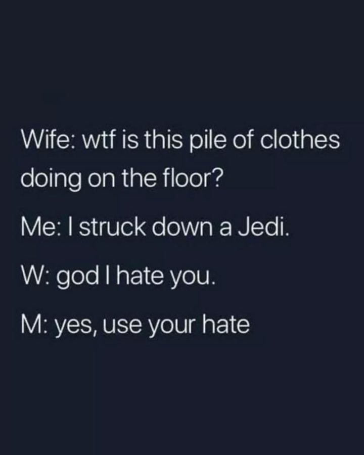 “Wife: Wtf is this pile of clothes doing on the floor? Me: I struck down a Jedi. Wife” God I hate you. Me: Yes, use your hate.”
