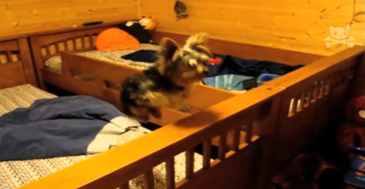 You would almost think that the hamster is controlling the dog with mind control because the Yorkie jumps non-stop in the same adorable pattern. While he’s only jumping from bed to bed, it almost seems like he’s jumping on trampolines!