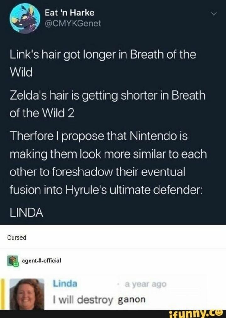 “Link’s hair got longer in Breath of the Wild. Zelda’s hair is getting shorter in Breath of the Wild 2. Therefore I propose that Nintendo is making them look more similar to each other to foreshadow their eventual fusion into Hyrule’s ultimate defender: LINDA. Linda: I will destroy Ganon.”
