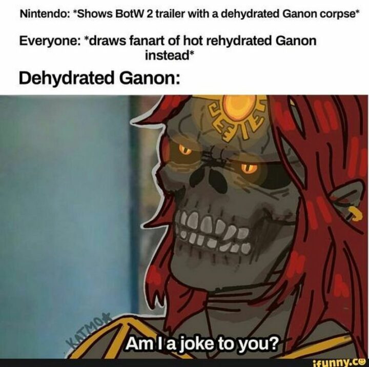 “Nintendo: Shows BotW 2 trailer with a dehydrated Ganon corpse. Everyone: Draws fanart of hot rehydrate Ganon instead. Dehydrated Ganon: Am I a joke to you?”