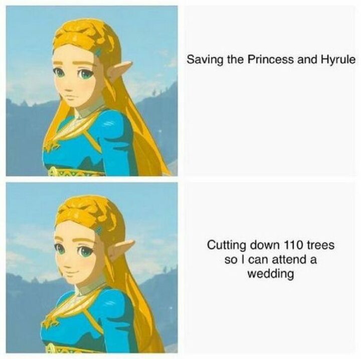 “Saving the Princess and Hyrule. Cutting down 110 trees so I can attend a wedding.”