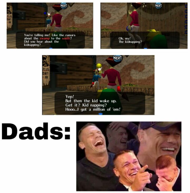 “You’re telling me! Like the rumors about the swamp to the south? Did you hear about the kidnapping? Oh, my! The kidnapping? Yep! But then the kid woke up. Get it? Kid napping? Hooo…I got a million of ’em. Dads:”