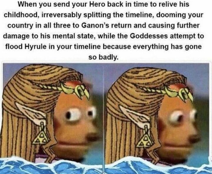 “When you send your hero back in time to relive his childhood, irreversible splitting the timeline, dooming your country in all three to Ganon’s return and causing further damage to his mental state, while the Goddesses attempt to flood Hyrule in your timeline because everything has gone so badly.”