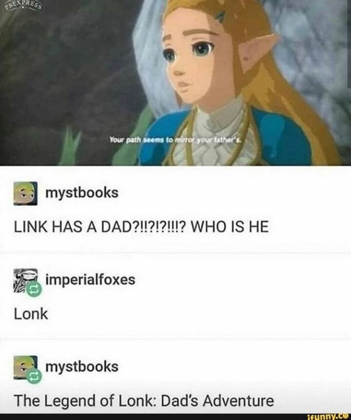 “Your path seems to mirror your father’s. Link has a dad?!!?!?!!!? Who is he? Lonk. The Legend of Lonk: Dad’s Adventure.”