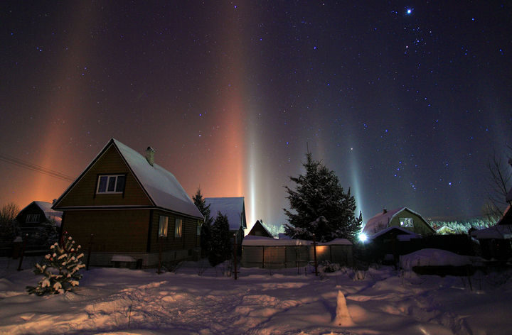 7) Light pillars illuminate the night sky over Moscow, Russia.